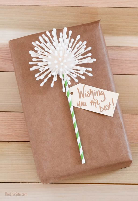 Utilizando cotonetes, canudo e uma bola de isopor cortada pela metade, você pode criar uma flor incrível para decorar a embalagem do seu presente. Fica bem semelhante a flor dente de leão. :)