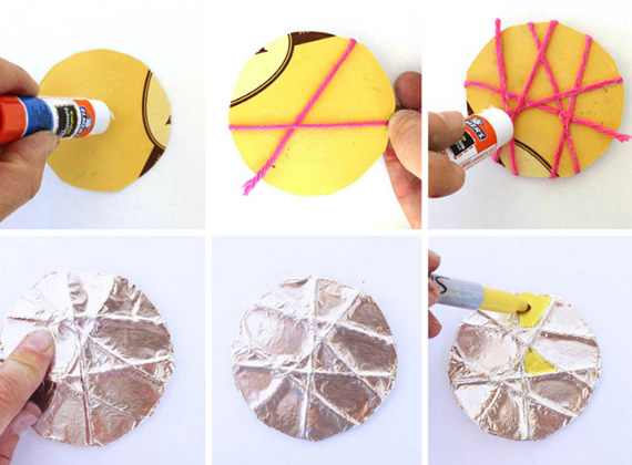 Você vai precisar de canetas marcadoras coloridas, barbante, cola bastão, papel alumínio e um papel de revista recortado em formato de círculo. Use um objeto circular para cortar