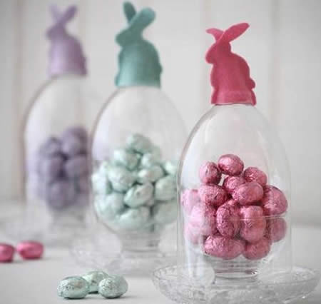 Com potinhos cheios de chocolates e tampas de coelhinho em feltro, você também cria uma linda lembrancinha para a Páscoa.