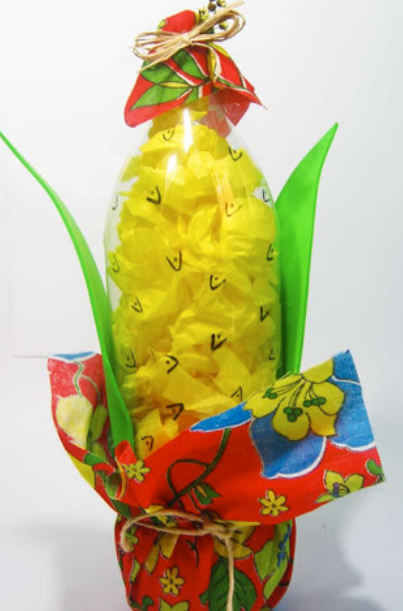 Olha que lindo ficou este milho decorativo com garrafa PET. É só preencher com papel crepom amarelo dentro, criar as folhinhas com EVA verde e arrematar os detalhes com tecido de chita e barbante. É só se inspirar com esses modelos de reciclagem para festa junina e criar os seus mimos também!