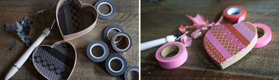 Os materiais que você vai precisar são simples, anote aí: fitas adesivas coloridas e estampadas, tesoura, estilete, fita para presente larga, caixinha com formato de coração, cola quente e bombons de sua preferência para colocar dentro da sua caixinha artesanal.