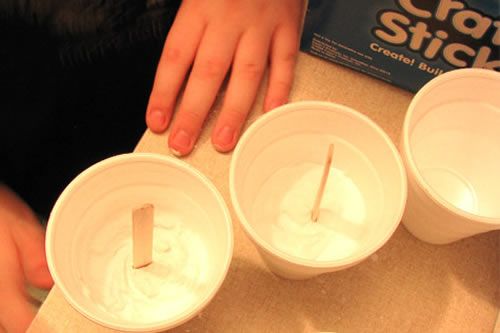 Primeiramente você vai colocar um pouco de gesso no copo e logo após, despejar também um pouco de água. Misture a solução e quando sentir que está começando a endurecer, enfie o palito de picolé.