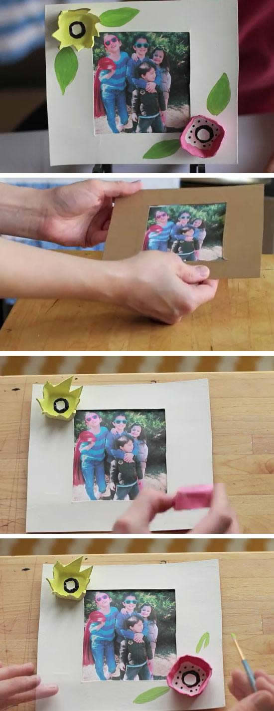 Fica lindo demais criar um porta-retratos decorados com cumbucas de caixas de ovo. Você pode pintá-las previamente e quando colocá-las no porta-retrato, pintar folhinhas! Assim vai ficar ainda mais delicado o seu artesanato.