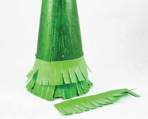 Depois que pintar o cone, faça tiras com franjinhas a partir do papel colorido na cor verde. É só fazer tiras com aproximadamente 4 cm de largura e cortar várias fendas com a tesoura para deixar as composições com franja. Dê um espaço de cerca de 1 cm entre um corte e outro da franja.
