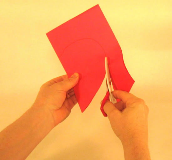 Agora com o papel vermelho dobradinho, corte com a tesoura o formato de metade de um coração. Assim, quando você abrir, terá um coração. Você pode fazer alguns testes antes em papel rascunho para aprender bem o formato ideal do corte.