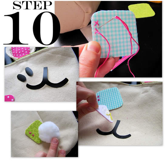 Por fim faça as orelhinhas com feltro, entretela e tecido estampado com a ajuda dos moldes que trouxemos. Use alfinetes para fixar e depois arremate costurando na máquina de costura.