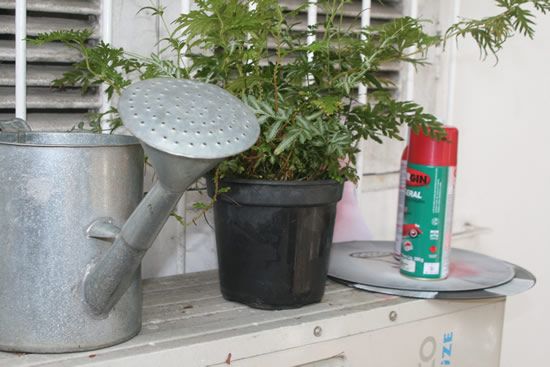 Note que o papel já está marcado com tinta, isto foi devido aos testes que o Rafa fez antes de pintar o regador de metal em definitivo. É uma boa ideia para você fazer também. Cole o papel com o molde vazado no regador (ou outro objeto escolhido) para poder usar como estêncil. Rafa usou cola-spray para deixar o papel em modo adesivo para grudar no regador. Mas se você não tiver cola-spray, pode usar cola bastão, é só colocar um tiquinho de nada. Outra opção é usar fita adesiva. Lembre-se que é só pra fixar temporariamente o estêncil de papel.