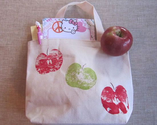 Agora é só ir decorando a sua sacola retornável de forma a fazer as maçãs de carimbos de impressão.