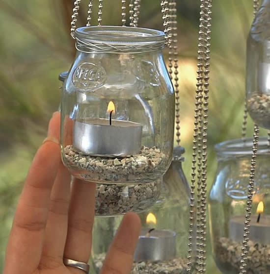 Em cada um dos potes, você irá colocar um pouco de pedriscos ou areia. Isso vai deixá-los mais pesados e dessa forma dar mais estabilidade a composição. Coloque uma vela em cada potinho e pendure em um lugar legal para começar a fazer todo o processo de equilíbrio do item decorativo. Você terá que fazer alguns testes para ver como os potes ficarão melhor dispostos. Depois é só curtir seu item deocrativo com uma iluminação charmosa e diferente.