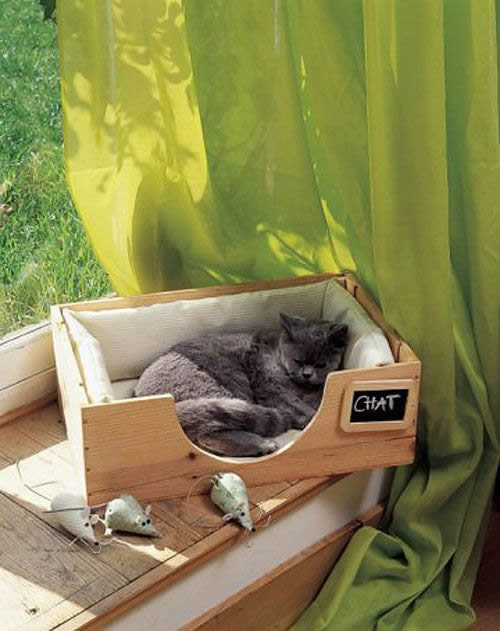 Crie também uma casinha ou caminha para o seu gato utilizando caixotes de madeira. Basta decorar como achar mais legal e colocar uma almofadinha.