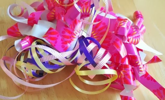 Faça o mesmo processo com a tesoura nos fitilhos coloridos. Tencionando com a lamina da tesoura e criando o aspecto cacheado.