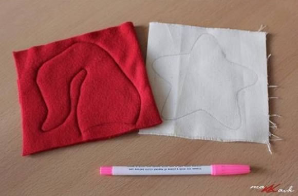 O primeiro passo é transferir os moldes impressos para os tecidos que você providenciou. Note que o chapeuzinho nós vamos fazer de feltro e a estrelinha com um tecido de algodão.