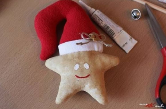 Agora costure o chapeuzinho numa das pontas da estrelinha para começar a arrematar a decoração de Natal que você está criando.