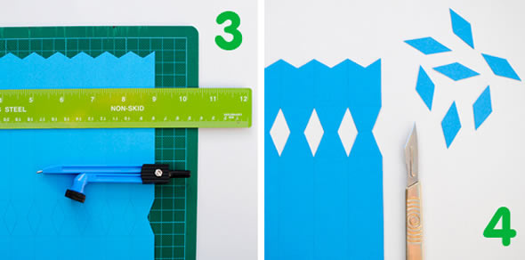 Com a ajuda de um estilete e uma régua, recorte os losangos demonstrados entre as linhas do molde. Com uma tesoura de ponta também dá pra fazer este recorte, é só ter cuidado e paciência na hora de cortar.