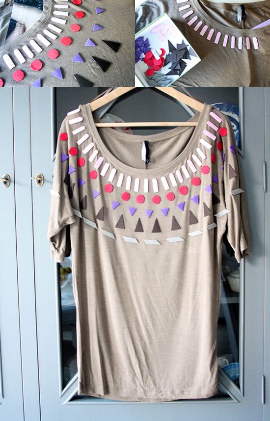 Veja os dois triângulos, o quadrado e o palito de picolé, que deverá estar cortado no meio. Você precisa de vários cópias de cada um destes itens. A forma que você vai dispor esses detalhes em sua blusa vai variar de acordo com a sua preferência.