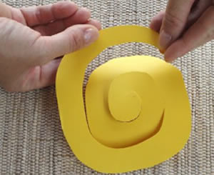 Veja como fica o papel recortado em espiral. Depois de cortar, você deverá enrolar a pontinha de fora para dentro até chegar no centro.