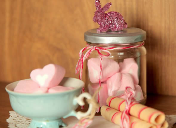 Veja o que você vai precisar: pote de vidro, chocolates branco, caneta marcadora, feltro branco e rosa, tesoura e cola quente. Você pode substituir os chocolates por algodão, se preferir.