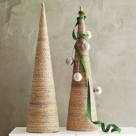 Faça criando um cone de papel e depois faça furinhos. Em seguida cobrir com o fio de sua preferência. Pode ser linha de crochê, fio de lã ou cordão encerado. Use velinhas de LED para deixar dentro iluminando e decorando com muito estilo a sua mesa de Natal.