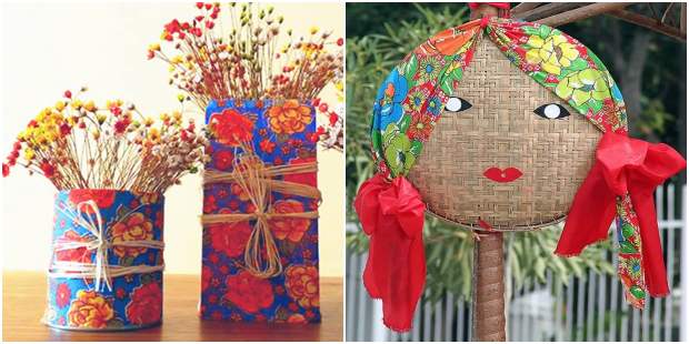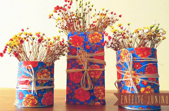 Outra ideia linda é encapar latas ou caixinhas tetrapak com tecido e criar enfeites fofos para sua festa junina. Embora você tenha que ter as latas, potes ou caixinhas para decorar, não é difícil conseguir estes potes para reciclar e criar sua decoração criativa para o São João.
