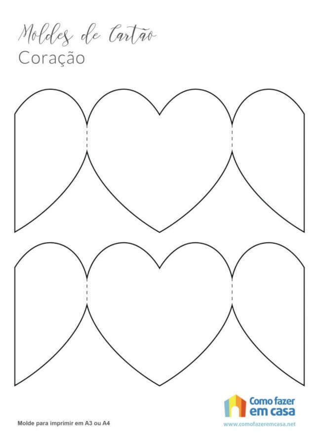 Aqui estão os cartões que podem servir como lembranças de dia dos pais, dia dos namorados, dia das mães, entre outros. Estes moldes de cartão de coração são muito simbólicos e super fofos. Além disso, ultra simples, pois não possuem muitas dobras ou colagens. Basta recortar e dobrar para fechar.