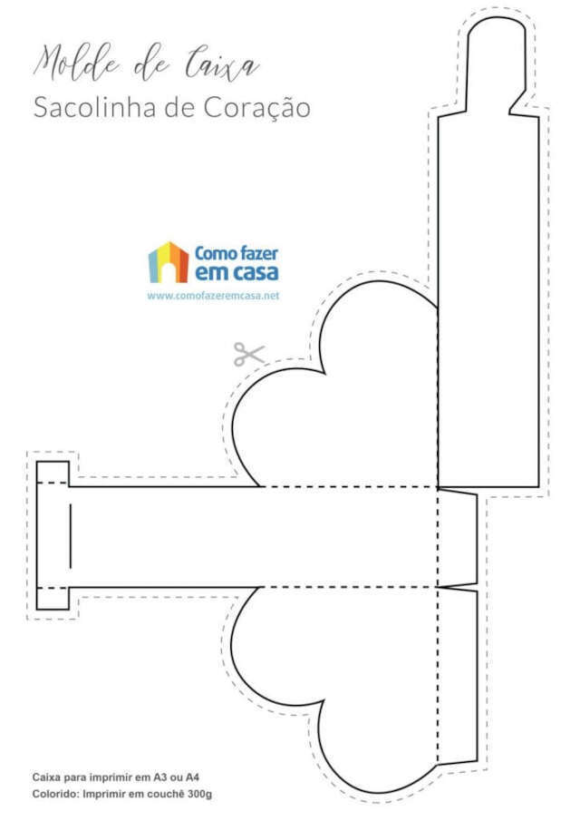 Estes dois primeiros são bem simples, por isso são ideias para treinar ou fazer em grande quantidade. Com estes moldes de caixa de coração é possível fazer sacolinhas de lembrancinhas para festas de aniversário, ou outros eventos comemorativos como batizados, por exemplo.
