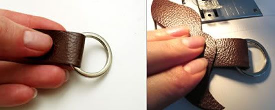 Passar o retângulo de couro pelo anel chaveiro e dobre ao meio, juntando as extremidades. Posicione esta tira de couro dobradinha, com o anel chaveiro entre ela, entre as duas peças recortadas de bigode.