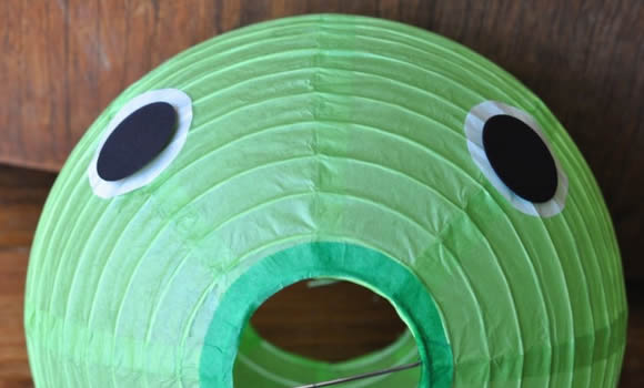 Corte círculos de papel branco e preto, sendo o branco maior e o preto menor. Cole o preto por cima do branco e fixe na luminária, perto da boca, simulando os olhinhos dele.
