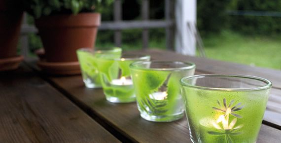 Dê ainda mais originalidade a sua confecção escolhendo folhas ou outras formas que possam ficar lindinhas em seus potinhos ou copos de vidro. Você pode fazer com pincel e tinta vitral também, se preferir. É só arranjar uma forma de prender a folha no vidro e pintar por cima. Fitas adesivas podem te ajudar na hora de fixar a folhinha no vidro.
