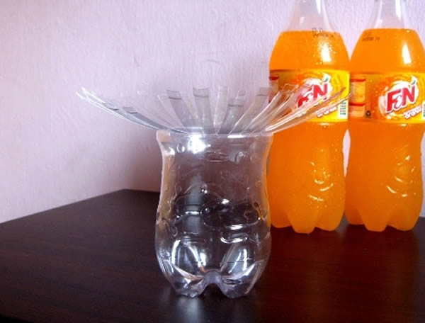 Depois que fazer o corte na parte superior, faça as tiras verticais de sua garrafa PET utilizando a tesoura. Faça do mesmo jeito que está mostrando na imagem abaixo. Estas tiras devem ter entre 3 e 5 cm de espessura. É só decidir o tamanho e fazê-las para ficar deste mesmo jeitinho.