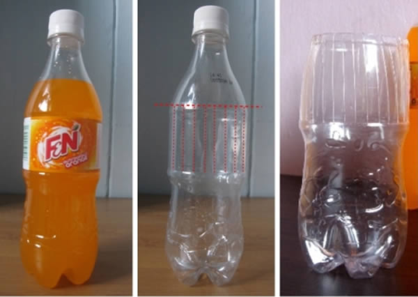 A primeira etapa é limpar e higienizar a garrafa plástica. Em seguida, corte em cima, numa altura perto de onde inicia a curvatura de superior da garrafa PET.