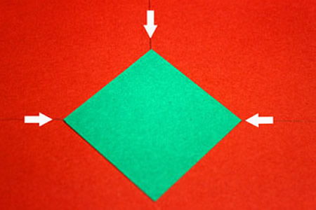 Antes de começar a colagem, meça o tamanho da moldura e corte a medida na cartolina vermelha. Depois dobre a folha verticalmente para marcar o meio. Com a linha que se formou, alinhe o quadrinho verde mais escuro, mas numa posição em que ele fique como um losango.