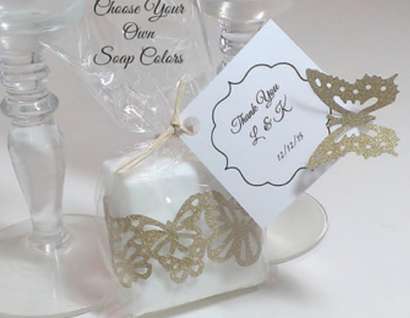 Esse sabonete para lembrancinha com essa tag/etiqueta ficou super legal. Um saquinho plástico e o cordão para embalar e uma decoração com borboletas de papel decoradas com Glitter dourado. Muito fofo!